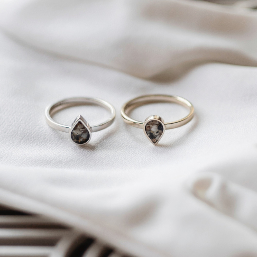 A csepp formájú foglalat könnyed eleganciát kölcsönöz a gyűrűnek, míg a hamvak megőrzése lehetővé teszi a múlttal való örök kapcsolatot.