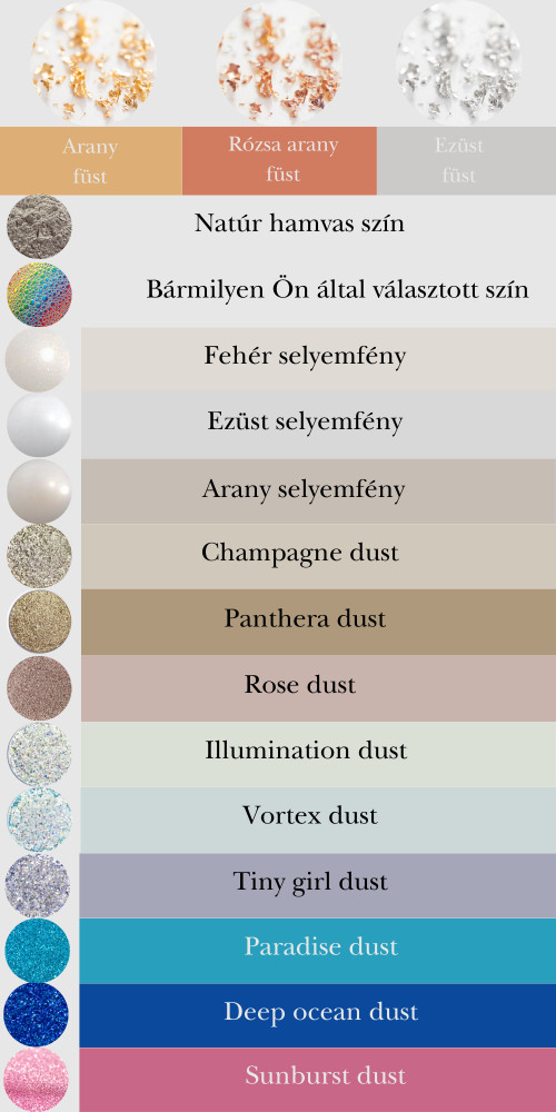 Aranyfüstöt, opált vagy színező pigmentet kérhetsz bele – így még személyesebbé válik az ékszered.